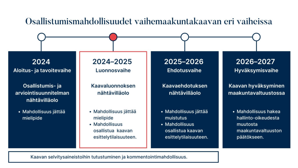Järjestetään työneuvotteluja kuntien ja muiden keskeisten sidosryhmien kanssa. Maakuntahallitus käsittelee kaavaluonnoksen ja päättää asettaa sen nähtäville. Kaavaluonnoksesta pyydetään lausunnot viranomaisilta, ja kaikilla osallisilla on mahdollisuus esittää mielipiteensä luonnoksesta. Kaavaluonnosta esitellään kunnittaisissa esittelytilaisuuksissa. Maakuntahallitus käsittelee vastineet lausuntoihin ja mielipiteisiin. Alustavan aikataulun mukaan kaavaluonnos olisi nähtävillä loppuvuodesta 2025.